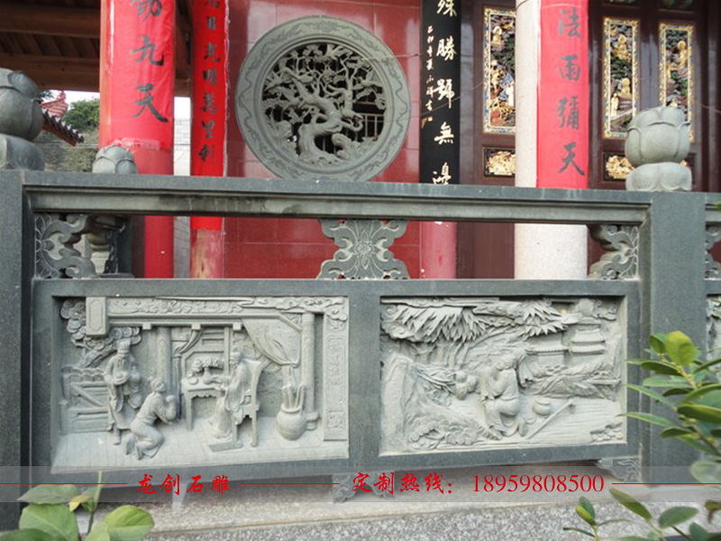 石欄桿欄板的浮雕是中國(guó)傳統(tǒng)建筑石欄桿上裝飾極強(qiáng)的表現(xiàn)形式,欄板的圖案千姿百態(tài),并不局限,內(nèi)容可以是花鳥(niǎo)草木,也可以是奇珍異獸,像寺廟欄桿也有一些宗教圖案在里面。