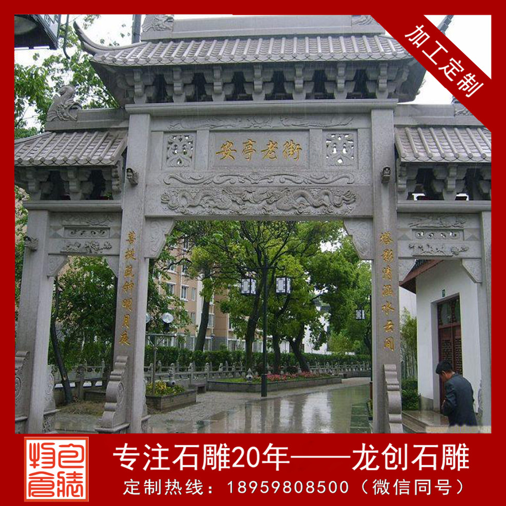 山門牌坊是中國建筑藝術中的主要代表,也是傳統建筑形式,在中國漫長的歷史長河中更見設計魅力。山門牌坊的出現其實可以追溯到原始社會時期,氏族聚居的部落都會有這樣的門型建筑,早期的設計比較簡單,就是兩根柱子和一根橫梁,從木山門牌坊到石山門牌坊,石雕技術讓山門牌坊擁有了更為細膩的雕刻情感。龍創石雕山門牌坊廠家作為國內雕刻歷史悠久的專業專業雕刻廠家,提供了更多精致的石雕山門牌坊作品,讓其演繹雕刻工藝的文化傳統。