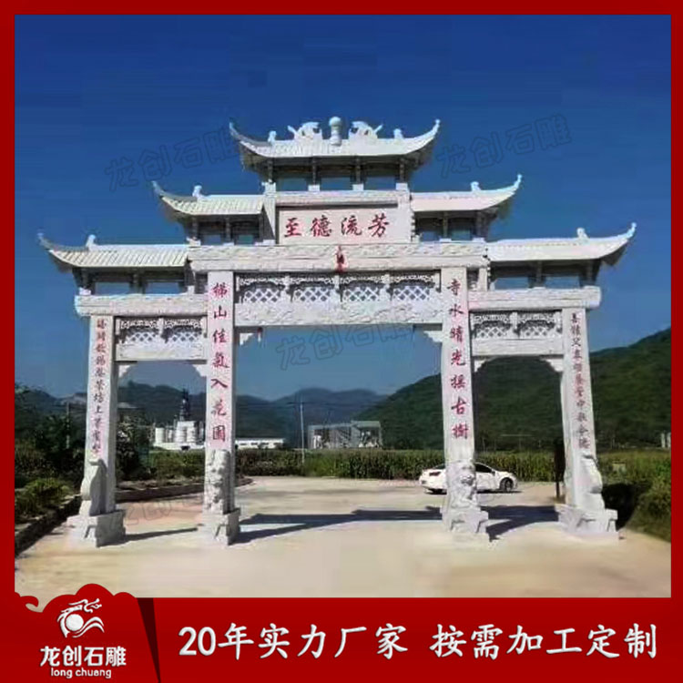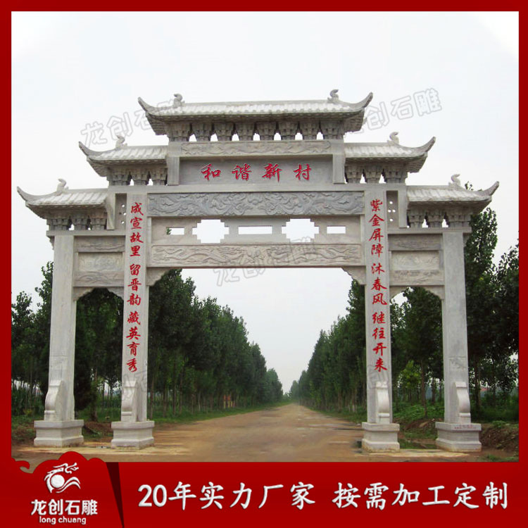 三門(mén)石雕牌坊在農(nóng)村地區(qū)也是比較常見(jiàn)的,三門(mén)五樓牌坊定制也比較多,尤其是現(xiàn)代一些新農(nóng)村建設(shè)中更是經(jīng)常可以看到這類三門(mén)石牌坊設(shè)計(jì)的農(nóng)村石牌坊。農(nóng)村地區(qū)的牌坊通常起到了標(biāo)志地名以及裝飾性作用,在實(shí)際雕刻的時(shí)候應(yīng)當(dāng)要考慮到農(nóng)村地區(qū)的特色以及風(fēng)土人情等情況,從而能夠雕刻出更為精致的石雕牌坊作品,展現(xiàn)牌坊的建筑之美。
