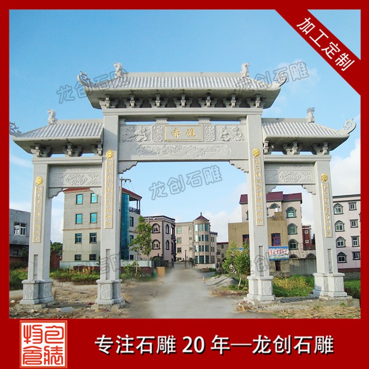 雕刻精美好看的中式景觀村口石牌樓,作為鄉村傳統文化中重要的組成部分,具有鮮明的地域性和文化性,對形成村莊格局和豐富鄉村空間形態,都產生了非常重要的影響。新村石牌坊、村口石牌樓是農村社會傳統文化的物質載體,記錄了農村地區的重要事件,同時也反映了新時期農民的思想道德觀念,以及對美好生活的期盼,也代表著新農村新形象。