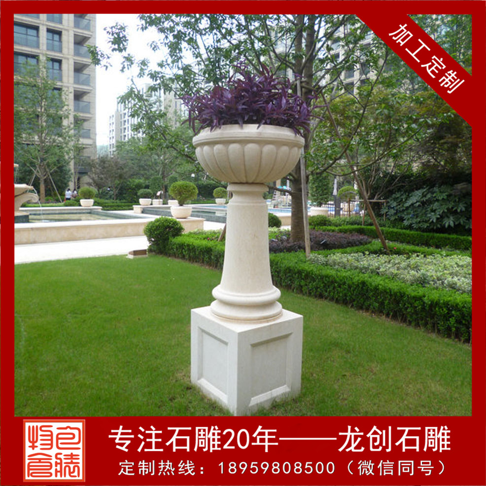 被精雕細琢而成的天然石雕花盆。形態(tài)逼真,許許如生。適用于小區(qū),廣場,園林,酒店,學(xué)校,戶外園林景觀工程等場所。這些花缽靈活多樣,隨處可用,尤其對于城鄉(xiāng)建筑比較密集和其他一些難于綠化地區(qū)的美化,有著特殊的意義。美化環(huán)境時,可根據(jù)缽、盆樣式、大小的不同,進行多種多樣的藝術(shù)組合。組合的形式可以是幾何式、自然式、混合式、集中布置、散置等,具體布局形式要由美化地點的具體情況決定。在較寬敞的地方,如廠前區(qū)、廣場、大型建筑門前、道路交叉口、停車場等處,小區(qū)石雕花盆可布置為樣式多變、五彩繽紛的小花壇,在商店、住宅的門前可隨機點綴一二。石雕噴泉花缽制作設(shè)計多種多樣,可以是圓形、半圓形、方形、多邊形等,立面可以分單層、多層等。設(shè)計的依據(jù)是要配合應(yīng)用地點的環(huán)境特點。